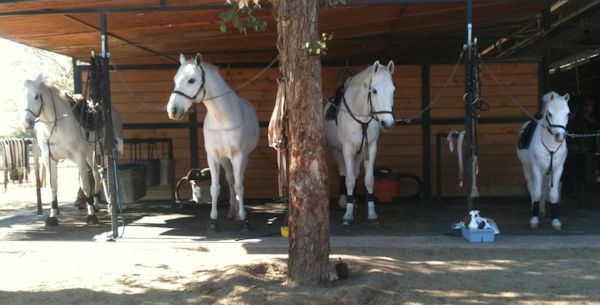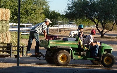 ![]() Dinner time! Mexicano and Pee Wee always get to help riding on the feed cart. | |