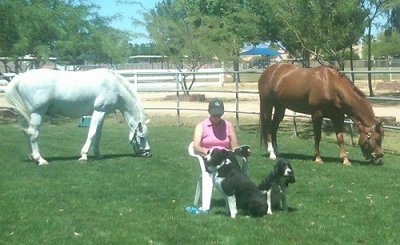 ![]() Here is Gigi grazing her two horses, Pk and Gunny. I think she is reading bedtime stories to them! |